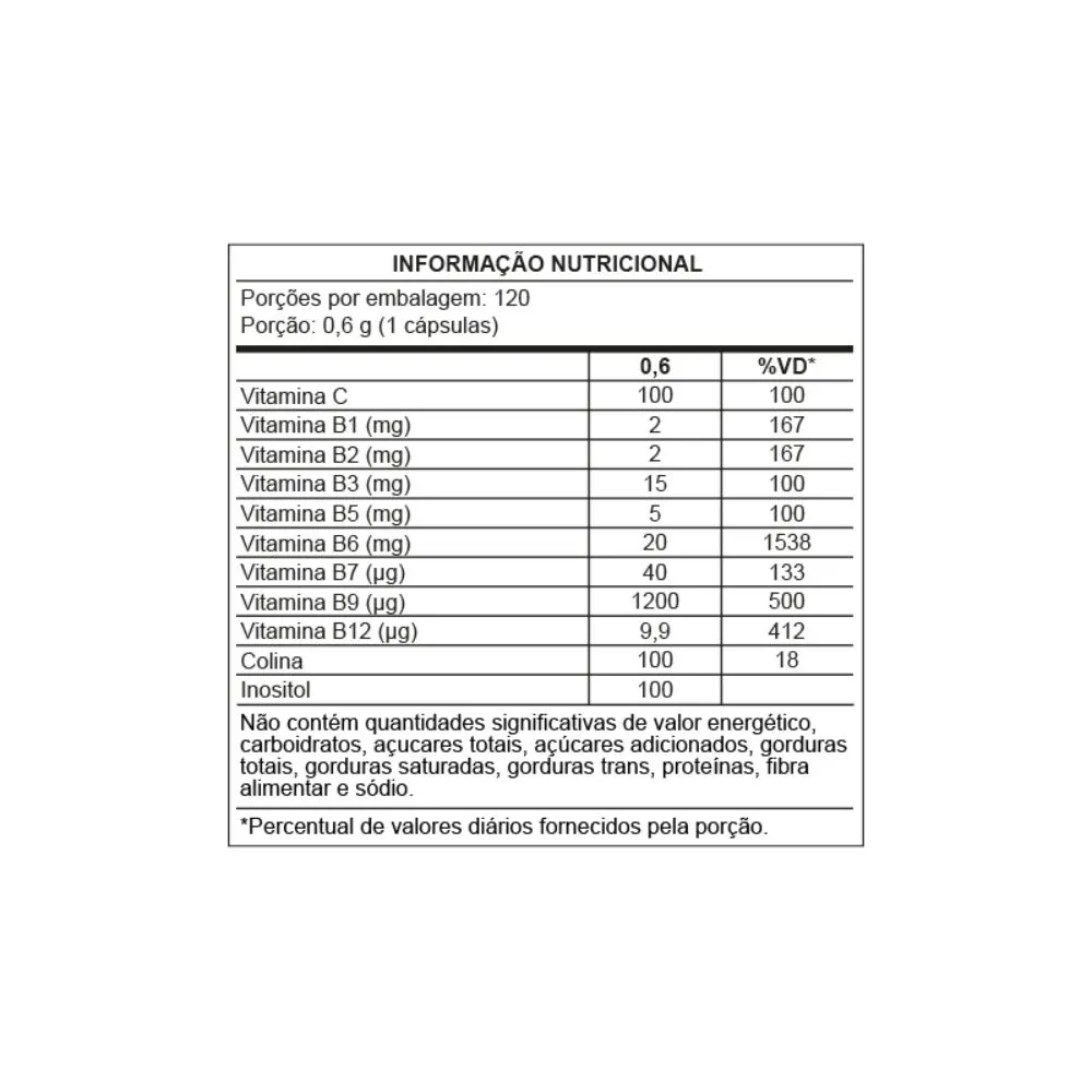 Ingredientes: Ácido ascórbico, bitartarato de colina, inositol, fosfato de piridoxal, nicotinamida, D-pantotenato de cálcio, cloridrato de tiamina, riboflavina-5-fosfato de sódio, L-metilfolato de cálcio, D-biotina, metilcobalamina, agente de massa celulose microcristalina, antiumectantes dióxido de silício e estearato de magnésio, gelificante gelatina e corante dióxido de titânio.