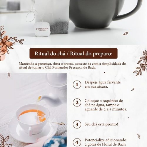 Chá misto de capim cidrão, laranja, stévia com manjericão, alecrim e comino. Composição de plantas medicinais que promovem equilíbrio emocional, colocando a mente em estado de calmaria. Recomendação: Potencialize seu chá com 4 gotas de Rescue