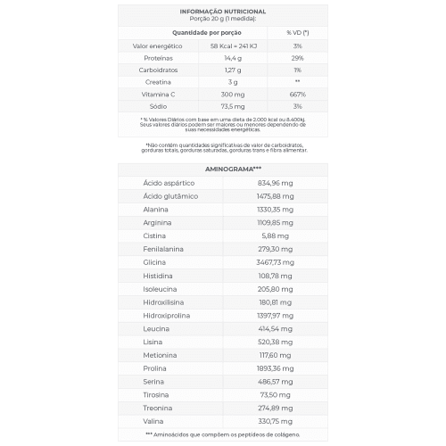 Porção 20g (1 medida). Valor energético: (58 Kcal = 241 KJ 3% VD), Proteínas (14,4 g 29%VD), Carboidratos (1,27 g 1%VD), Creatina (3g **VD), Vitamina C (300mg 667% VD), Sódio (73,5 mg 3% VD).