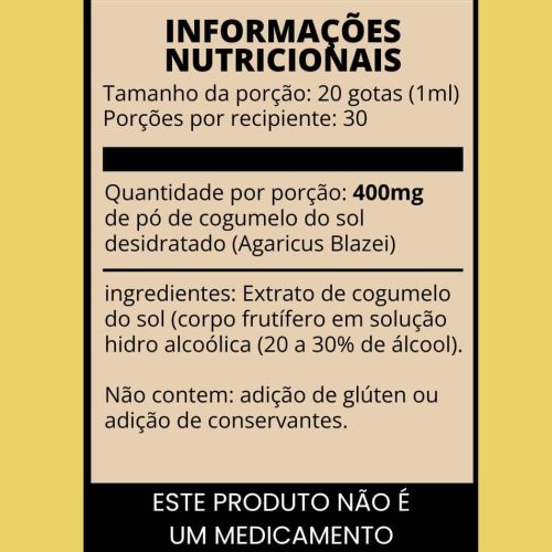 Extrato de cogumelo agaricus blazei (corpo frutífero – estroma) em solução hidro alcoólica (20 a 30% de álcool).