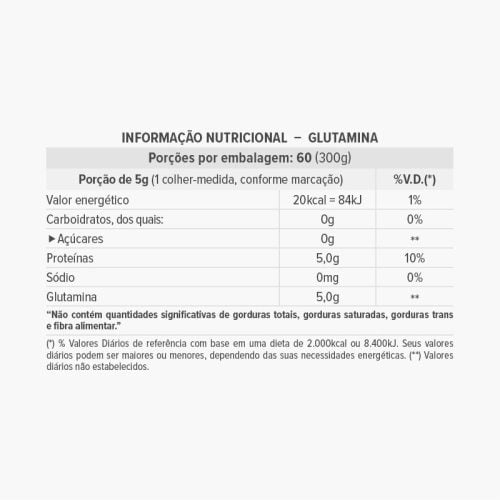 Coloque uma atenção especial na lista de ingredientes: o ingrediente que estiver em maior quantidade vem primeiro, e assim por diante. Você vai perceber que Glutamina, como outros produtos da linha Essential Nutrition, é livre de calorias vazias e cheios de ingredientes naturais. Tudo que adicionamos contribui para uma nutrição mais completa.