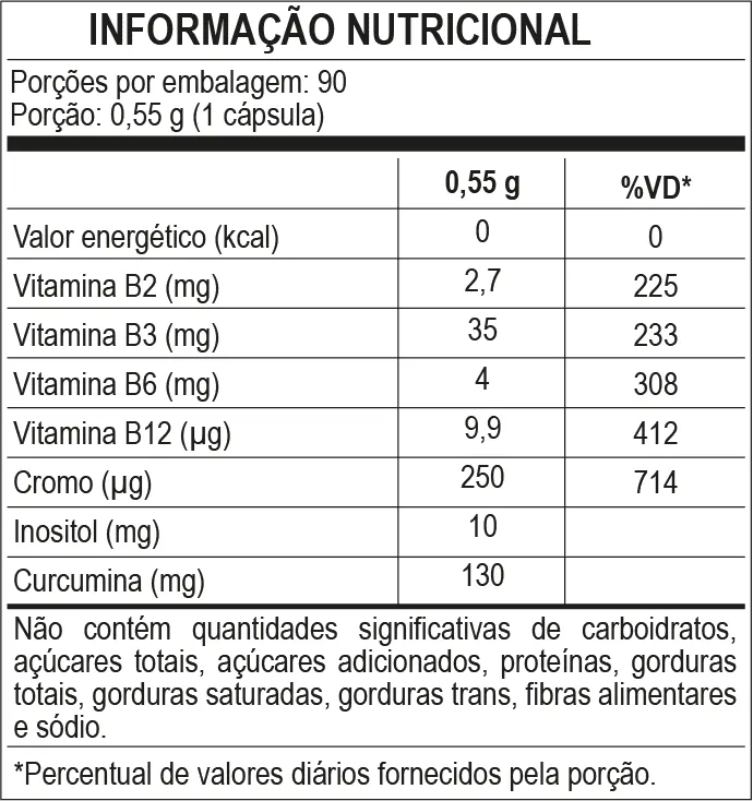 É uma fórmula que associa a cúrcuma a um blend de vitaminas do complexo B, Inositol e cromo, para potencializar a ação dos seus benefícios. Cada componente foi estudado e dosado de forma harmônica, em uma formulação na qual os ativos se complementam e se potencializam quando combinados.