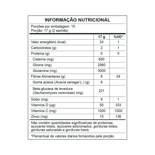 | Porções por embalagem: 15 • Porção: 17 g (2 sachês) | ||