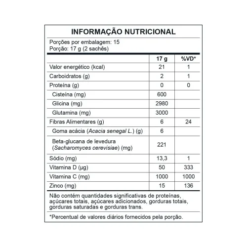 | Porções por embalagem: 15 • Porção: 17 g (2 sachês) | ||