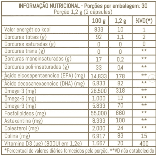 Óleo de Krill (Euphasia superba) e Colecalciferol. Cápsula: Gelatina, Água, Agentes de Massa Glicerina e Sorbitol. NÃO CONTÉM GLÚTEN. ALÉRGICOS: CONTÉM DERIVADOS DE CRUSTÁCEOS.