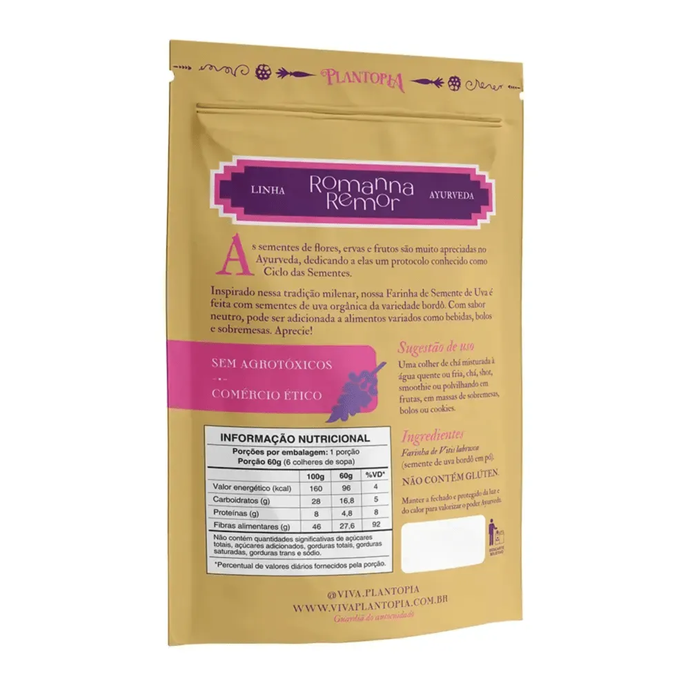 Inspirada no protocolo do Ciclo das Sementes da Ayurveda, a farinha Vitis Vinifera é feita com sementes de uva orgânica da variedade bordô.